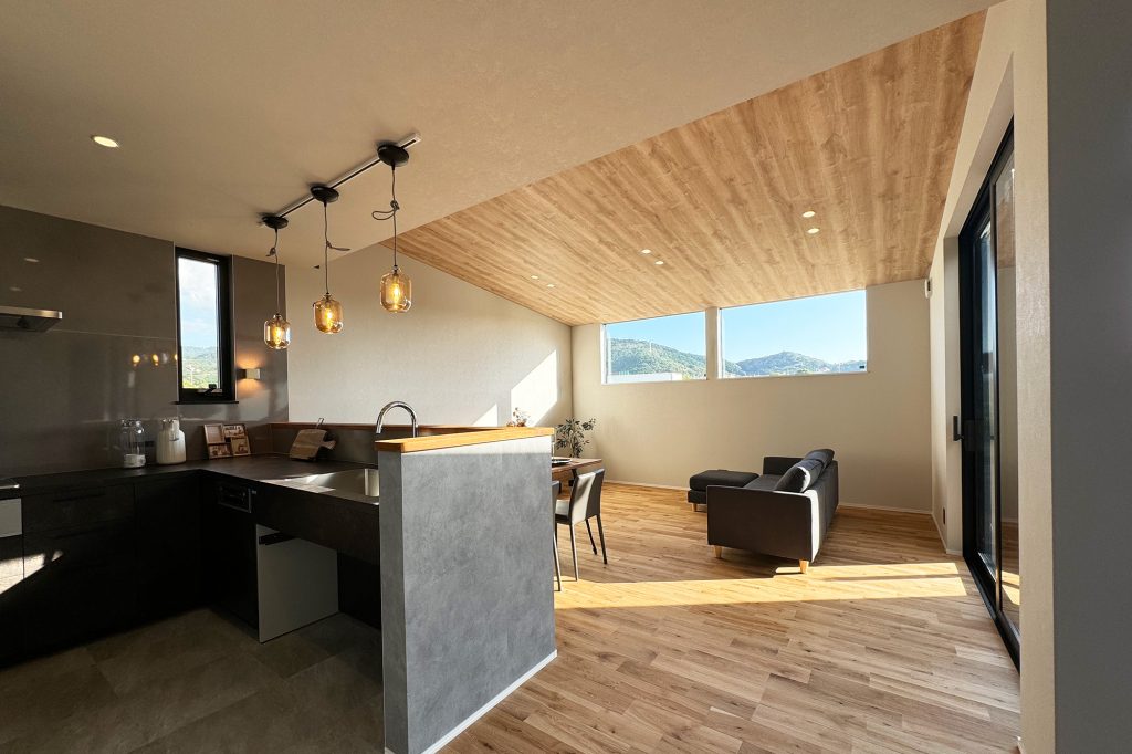 外壁材を組み合わせた外観デザイン - リビングの勾配天井にはアクセントに