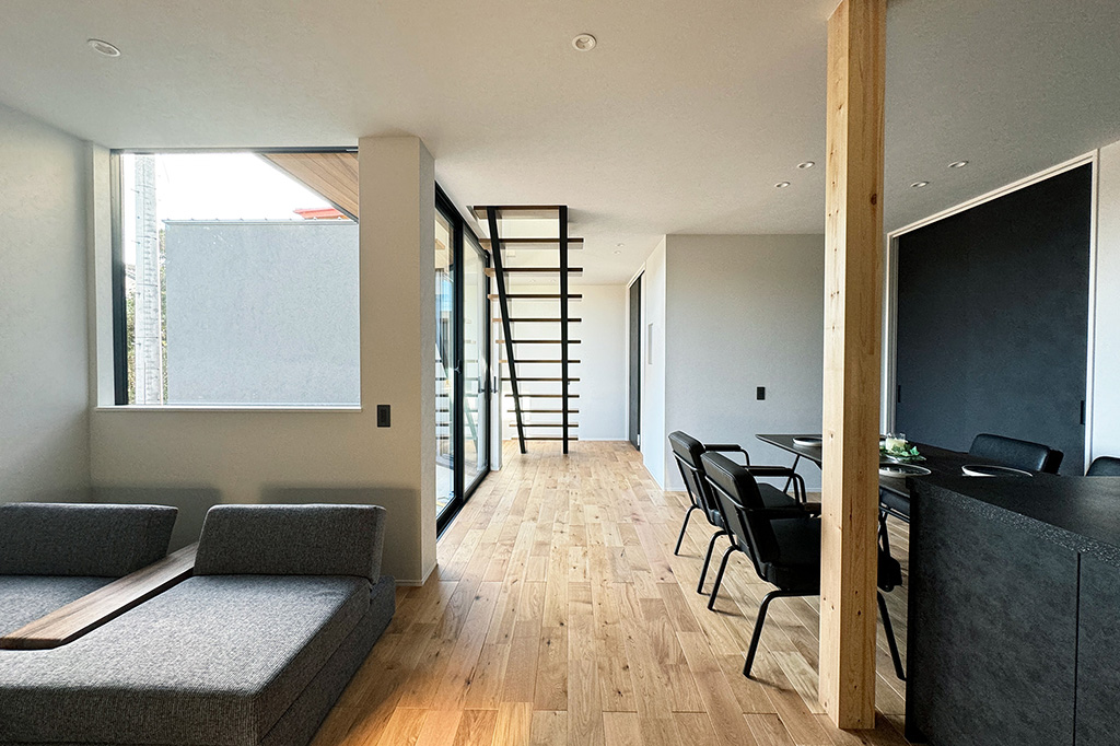 シンプルモダンな外観デザイン - リビング床には大判のタイルを採用し