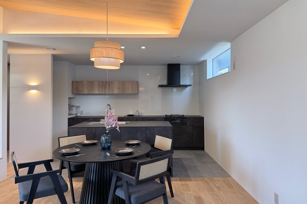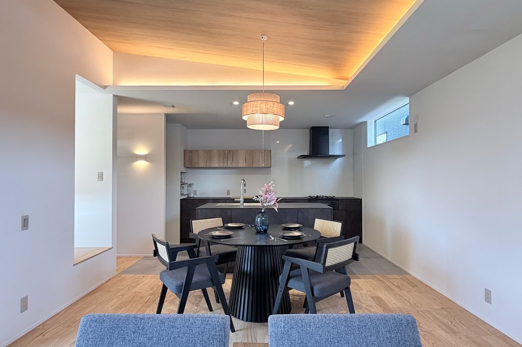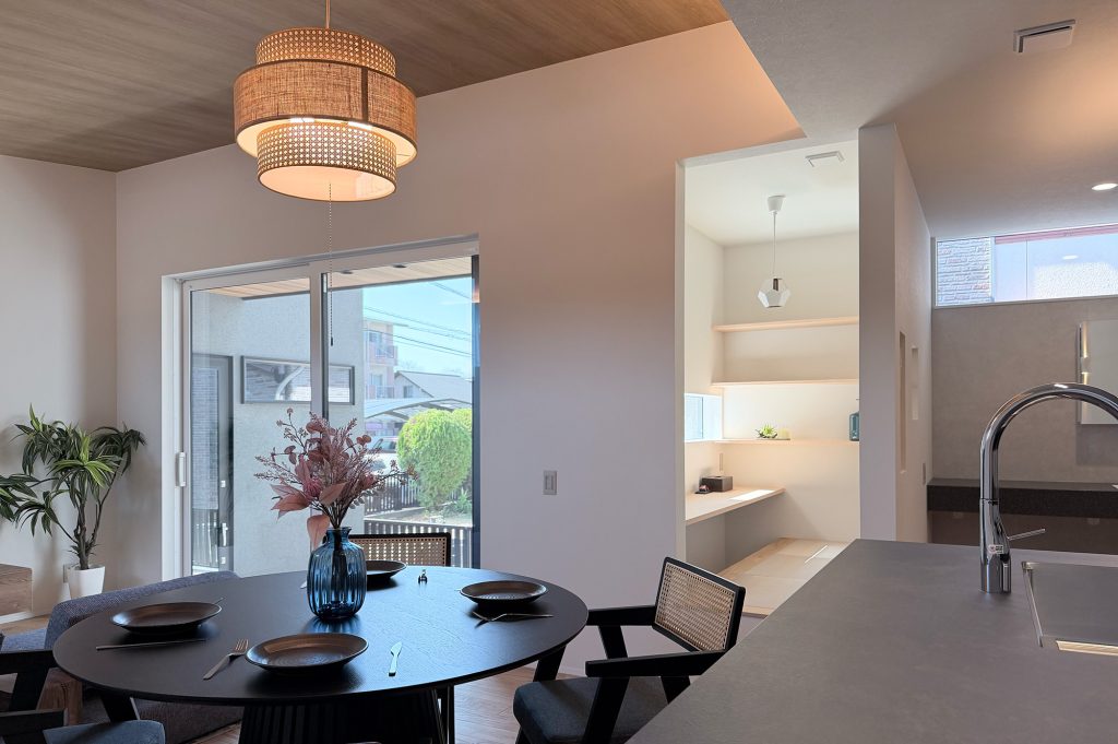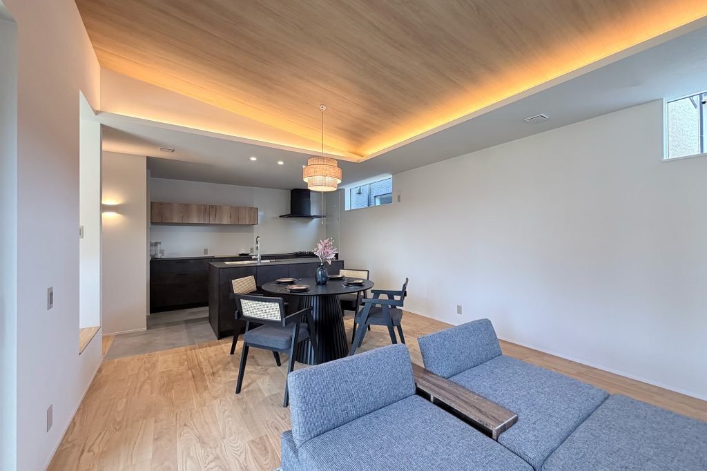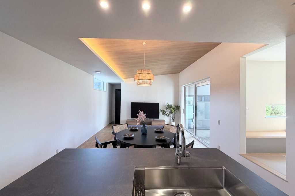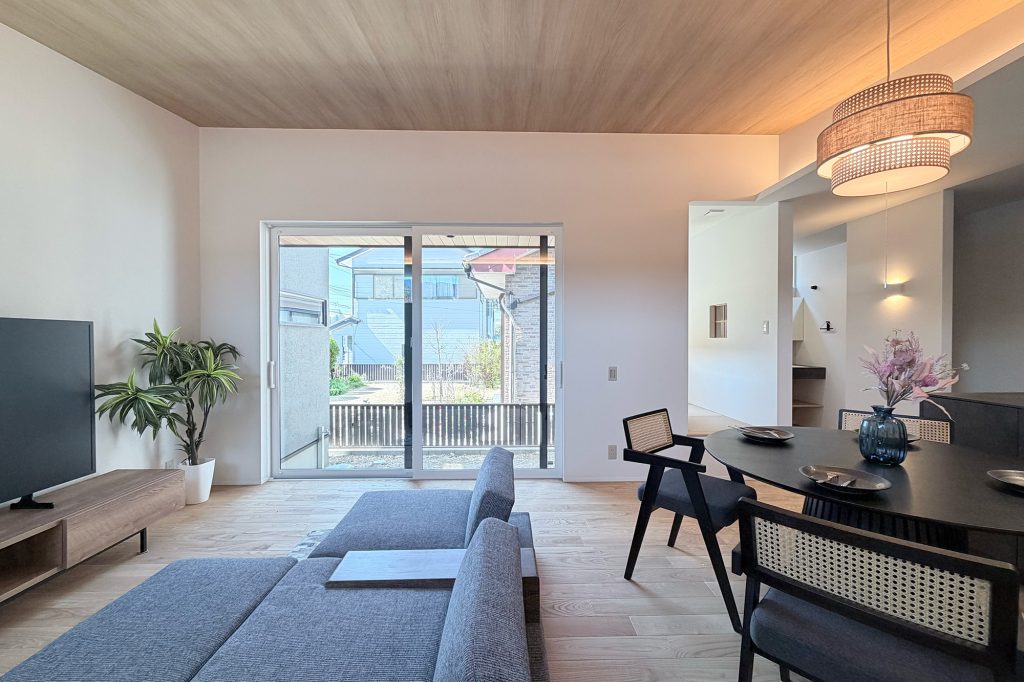 勾配天井と大開口の窓がもたらす面積以上の開放感。
