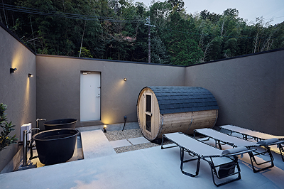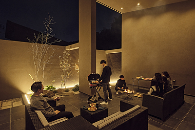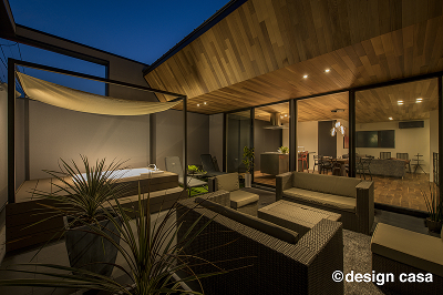 広い中庭や軒の深い設計、サウナやジャグジーなど趣味を大切にした空間で、